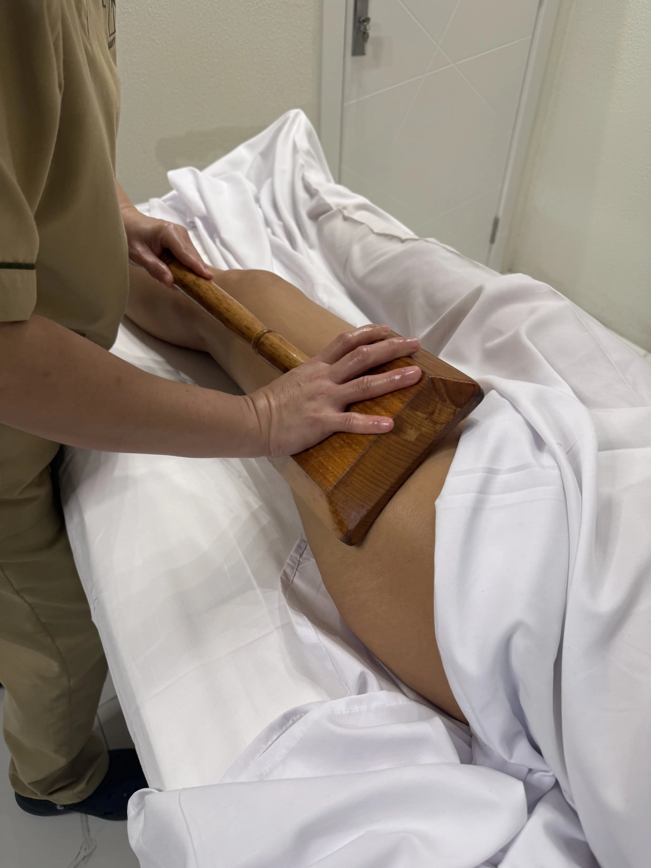 A non-invasive massage using wooden tools to activate circulation, reduce cellulite, and tone the body. Effective for detox, body shaping, and smoothing uneven skin texture.