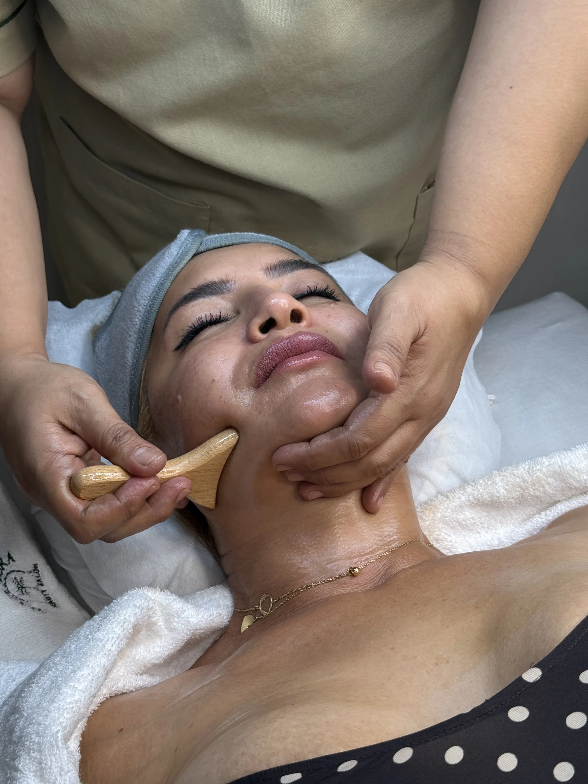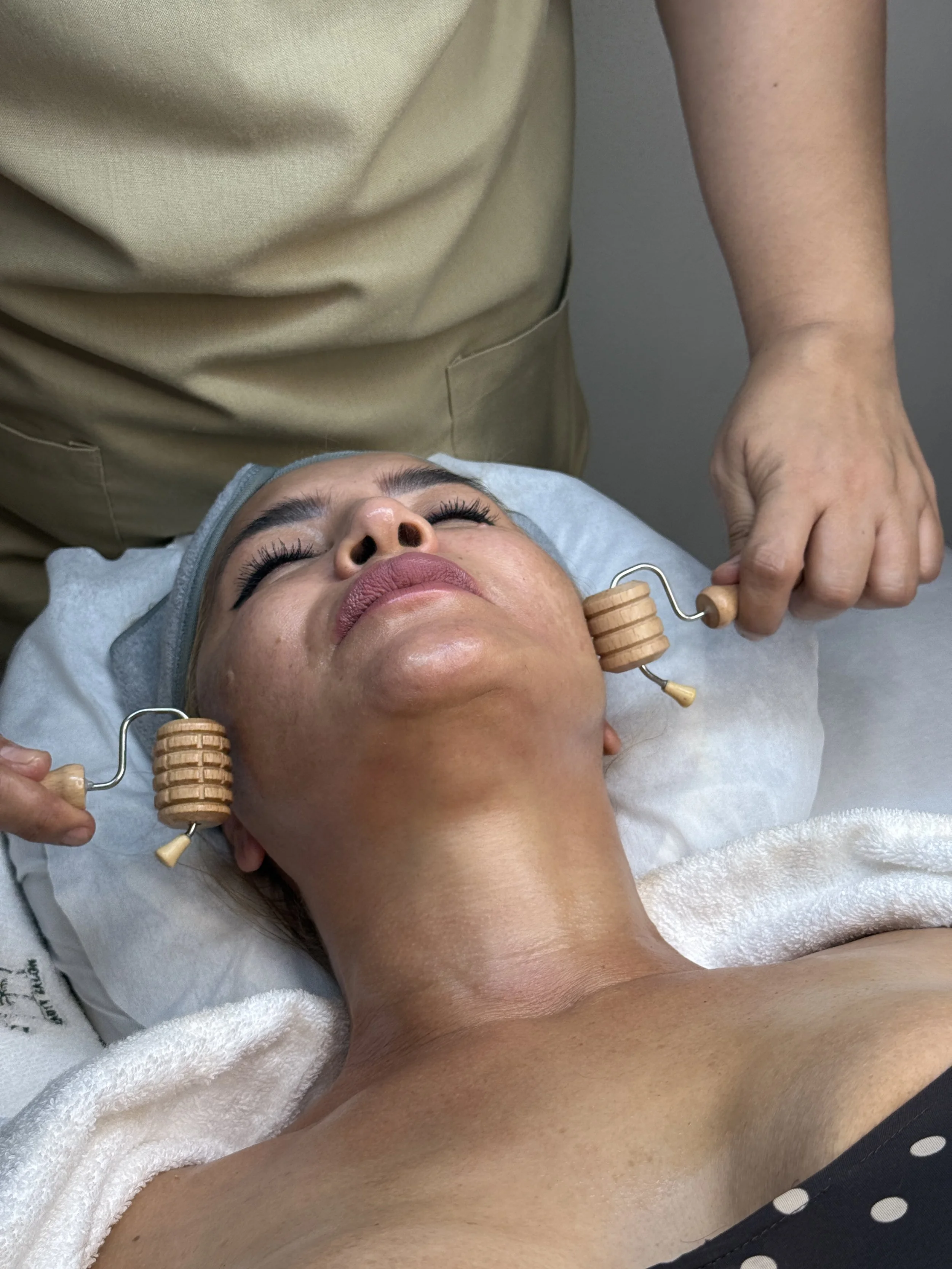 This relaxing face massage uses small wooden tools to lift, tone, and reduce puffiness. Boosts collagen, circulation, and creates a naturally contoured look.